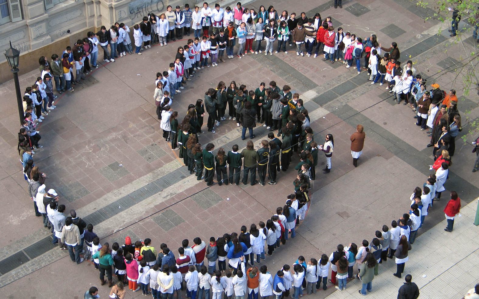 QUILMES, Argentina, 2 ottobre 2019: alunni e alunne di Quilmes festeggiano la giornata internazionale costruendo un simbolo umano della nonviolenza.