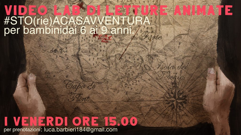 Video-laboratori (Webinar) di letture animate: #STO(RIE)ACASAVVENTURA rivolti a bambini dai 6 ai 9 anni, il venerdì alle 15.00 Durante il laboratorio si alterneranno momenti di lettura animata, piccole riflessioni e spunti per entrare maggiormente nella storia ed assaporare l’avventura! ll primo video-laboratorio è gratuito, per ogni seguente è chiesto un contributo di 3 euro